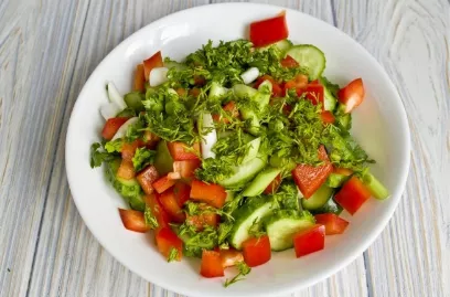 Cut tomatoes and peppers into slices, cucumber and eggs into cubes, mix, add onion and herbs. Fill with oil. Salt to taste.
