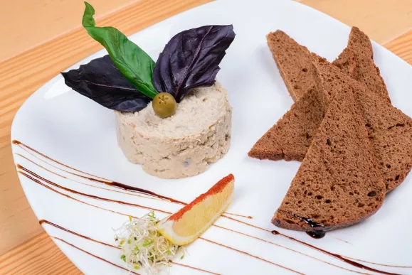 Lightly salted or soaked in water herring is cleaned of skin and bones, milled in a combine, add the pulp of a roll soaked in water, peeled raw apples and pass it through a blender a second time. Hard-boiled eggs are divided into two parts, the whites are separated from the yolks. Rub the yolks with vinegar, chop the whites and mix with herring, add pepper, mix. Decorate with herbs, circles of hard-boiled eggs and sprinkle with green onions.