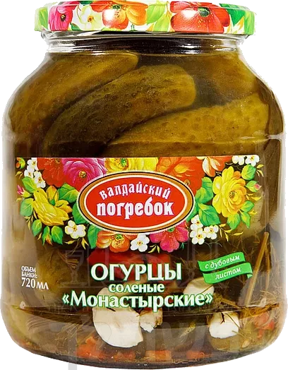 מלפפונים כבושים "Monastyrskie" עם עלה אלון Valdai Podgrebok, 720 גרם - he.kosherlekha.co.il